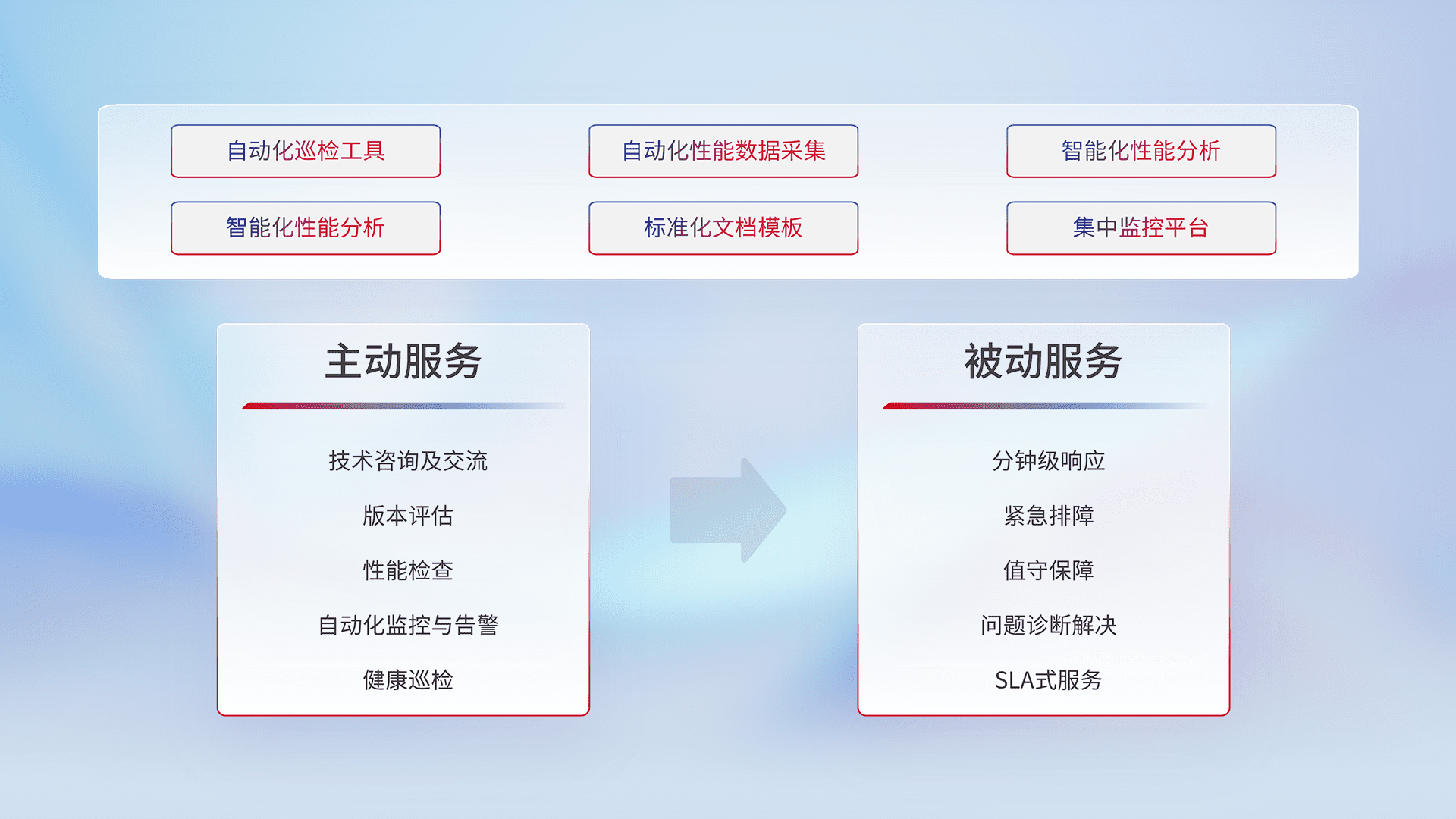 智能化工具和标准化文档,,,,保障服务质量,,提供主动服务(包含技术咨询、、、版本评估、、、、性能检查、、、自动化监控与告警、、、健康巡检)和被动服务包含(分钟级响应、、紧急排障、、、、值守保障、、、问题诊断解决、、SLA服务)。。。。